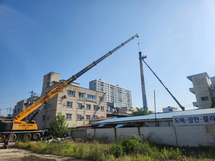 | ▲ 노후 목욕탕 굴뚝 철거작업 모습 [진주시 제공] |