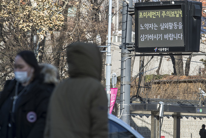 ▲ 서울 전역에 초미세먼지 주의보가 발령된 지난 7일 오전 서울 중구 인근 전광판에 초미세먼지 주의 안내 문구가 나오고 있다. [정병혁 기자]