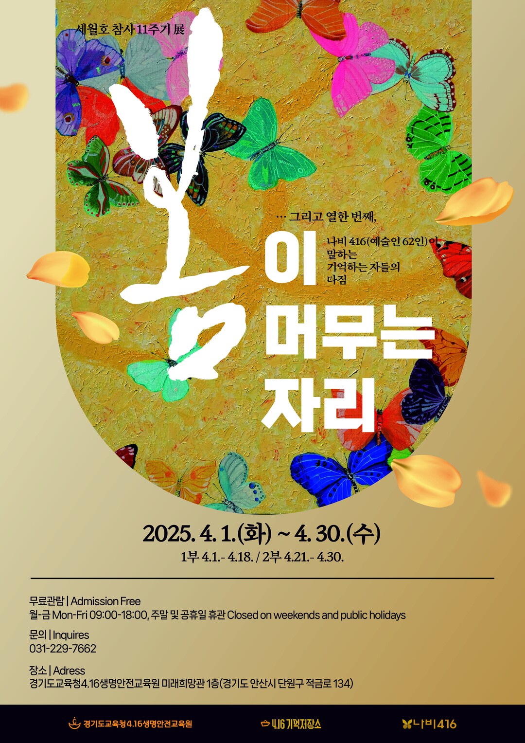 경기도교육청4.16생명안전교육원 미래희망관 1층에서 열리는 이번 전시는 경기도교육청4.16생명안전교육원, 4.16기억저장소, 나비416이 공동으로 주최·주관하는 행사다.