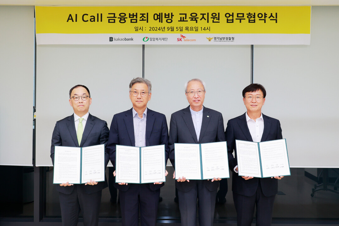 경기남부경찰청는 지난 5일 오후 서울 강남구 소재 밀알복지재단에서 신종 악성사기 근절을 위해, 카카오뱅크‧밀알복지재단‧SK텔레콤과 'AI Call 금융범죄 예방 교육 지원' 업무협약을 체결했다고 6일 밝혔다.