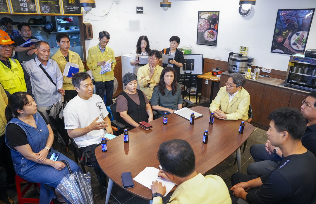 | ▲ 강기정 광주광역시장이 지난 12일 서구 금호동 도시철도2호선 상수도 누수피해 현장을 찾아 복구상황을 점검하고 피해상가 상인들의 애로사항을 청취하고 있다. [광주광역시 제공] |