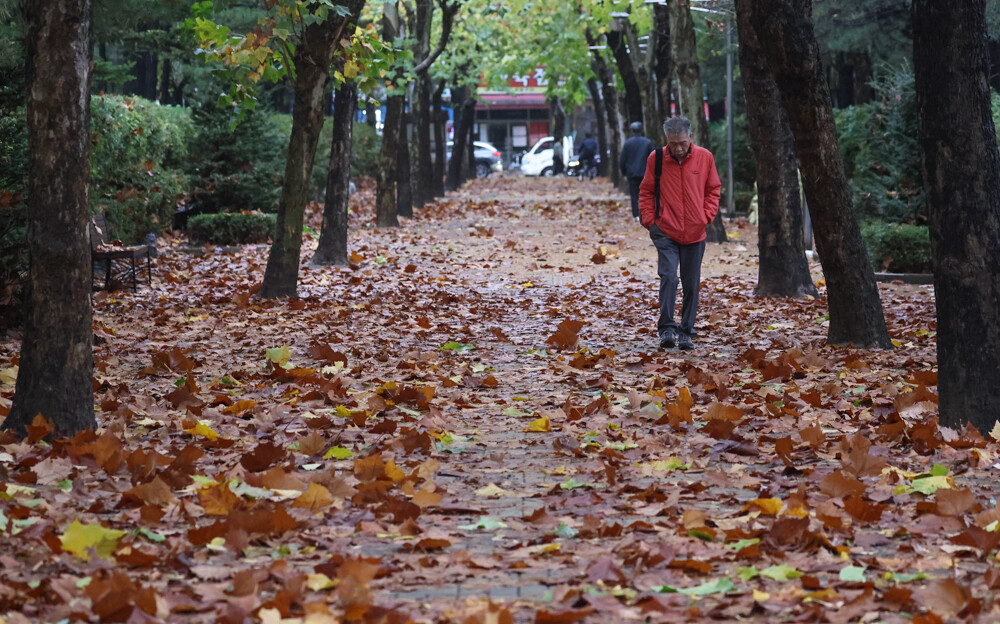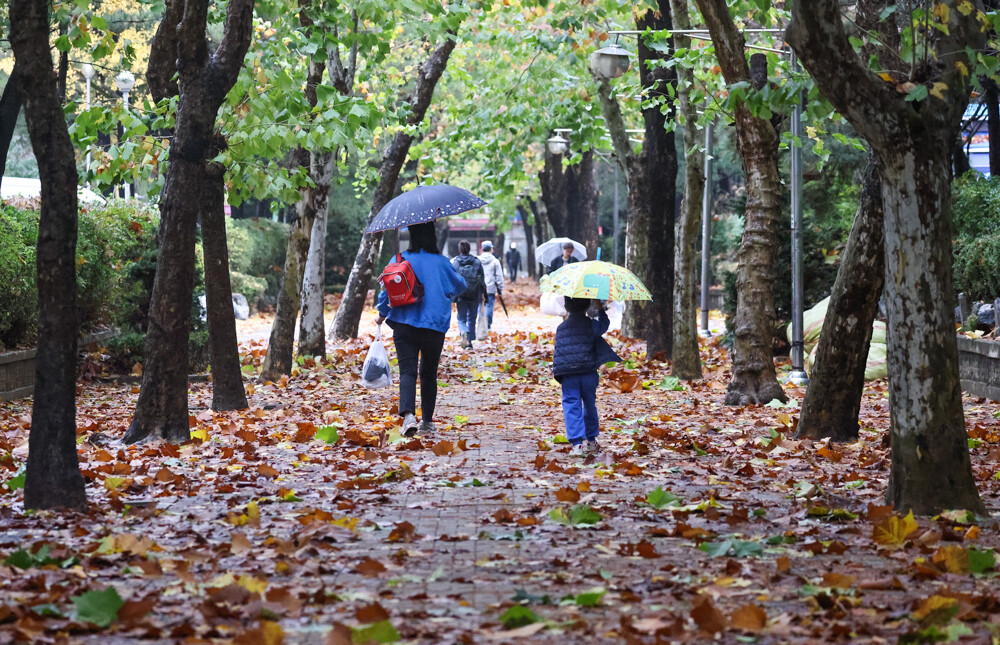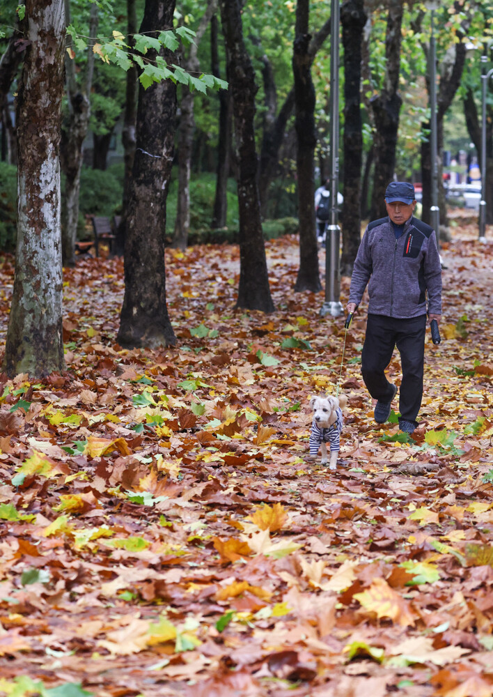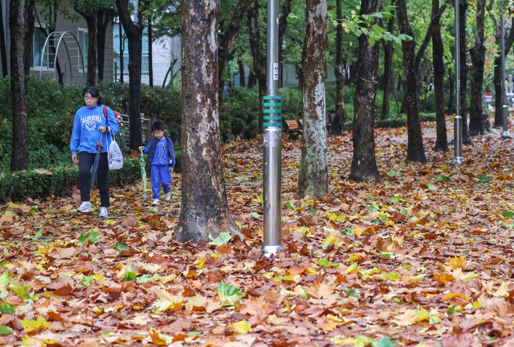 | ▲ 강풍을 동반한 비로 6일 아침 일산신도시 아파트 주변 공원에 밤새 수북하게 쌓인 낙엽을 밟으며 주민들이 지나가고 있다. [이상훈 선임기자] |