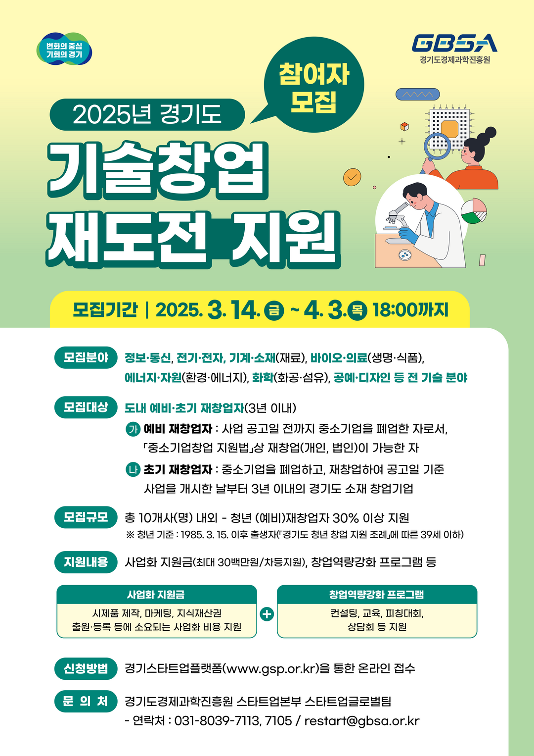 경기도와 경기도경제과학진흥원은 다음 달 3일까지 '2025년 경기도 기술창업 재도전 지원 사업' 참여기업을 모집한다고 19일 밝혔다.