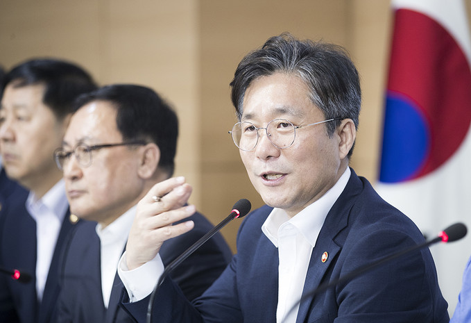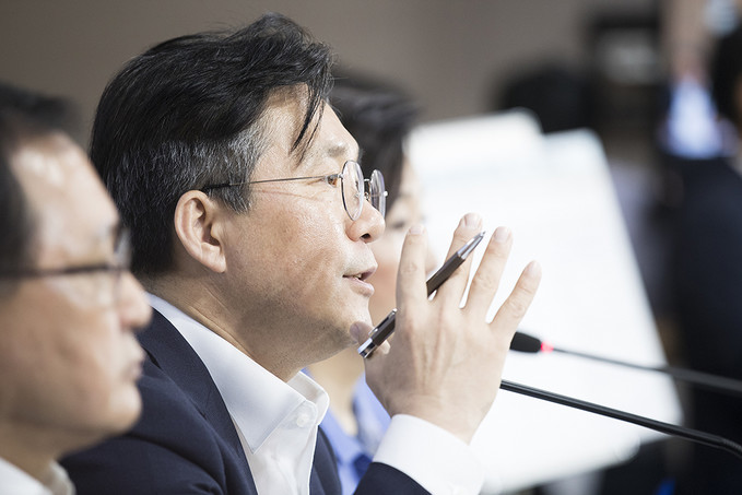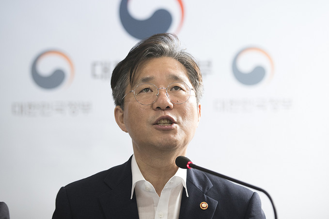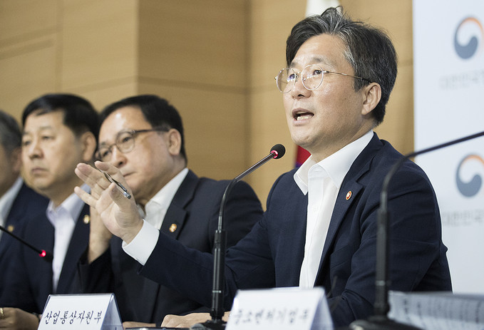 성윤모 산업통상자원부 장관이 5일 오전 서울 종로구 정부서울청사에서 대외의존형 산업구조 탈피를 위한 소재·부품·장비 경쟁력 강화 대책을 발표하고 있다.