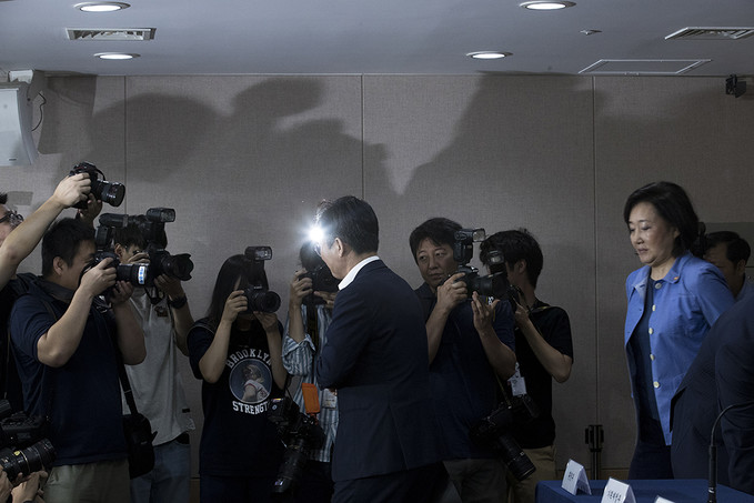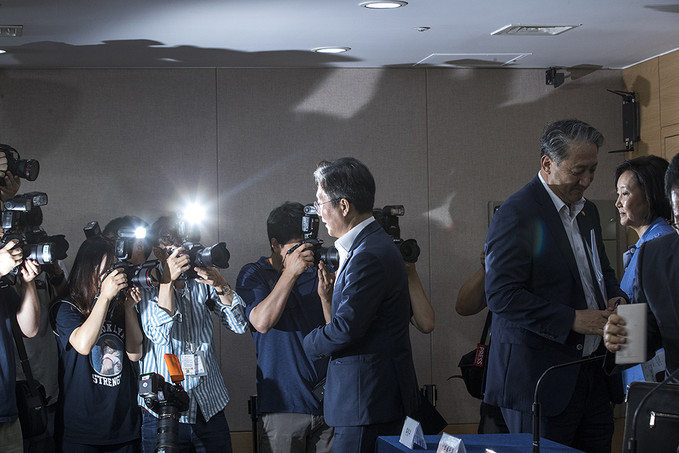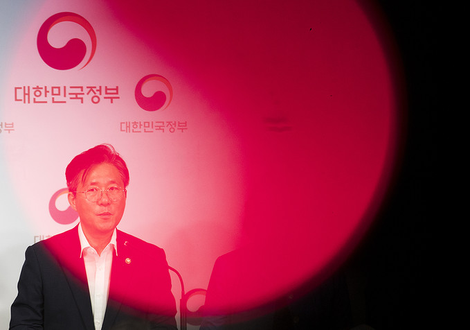 성윤모 산업통상자원부 장관이 5일 오전 서울 종로구 정부서울청사에서 대외의존형 산업구조 탈피를 위한 소재·부품·장비 경쟁력 강화 대책을 발표를 마친 뒤 나가고 있다.