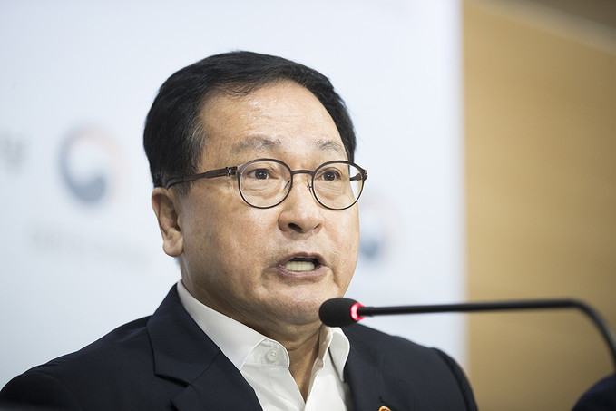 유영민 과학기술정보통신부 장관이 5일 오전 서울 종로구 정부서울청사에서 대외의존형 산업구조 탈피를 위한 소재·부품·장비 경쟁력 강화 대책을 발표하고 있다.