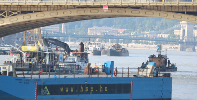 ▲ 6일 오전(현지시각) 헝가리 부다페스트 다뉴브강 사고현장에는 선체 인양에 동원될 선박이 정박해 있다. [뉴시스]