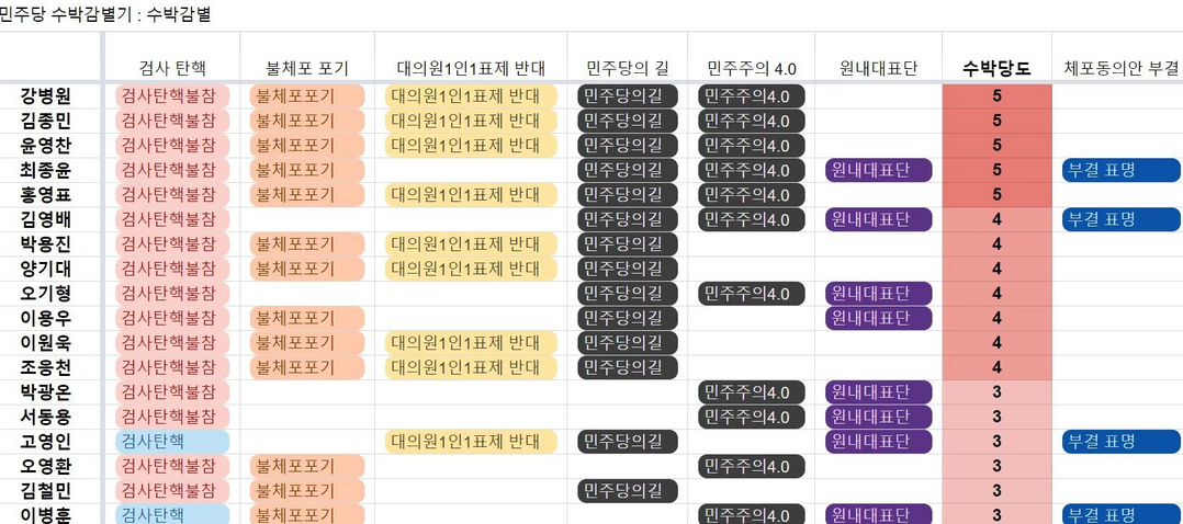 수박 판별 기준은 △'비위 검사 탄핵 법안 발의'에 주저했던 의원 △'국회의원 불체포특권 포기' 선언 의원 △'대의원제 정상화 개혁안'에 반대한 의원 등이다. 모든 항목에 해당되는 김종민, 윤영찬 의원 등은 당도 5'로, 친명계 정청래 최고위원은 '당도 0'로 분류됐다.