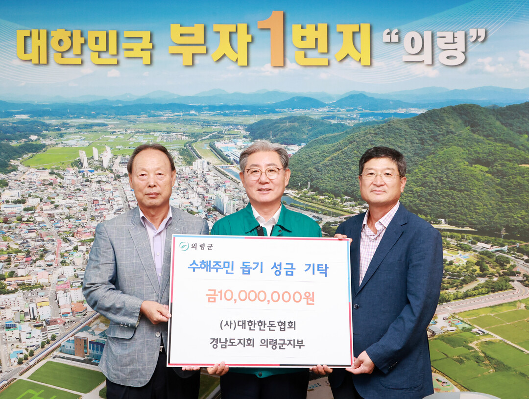 경남 의령군은 대한한돈협회 의령군지부(지부장 채영국)가 수해 복구 성금 1000만 원을 기탁했다고 20일 밝혔다,