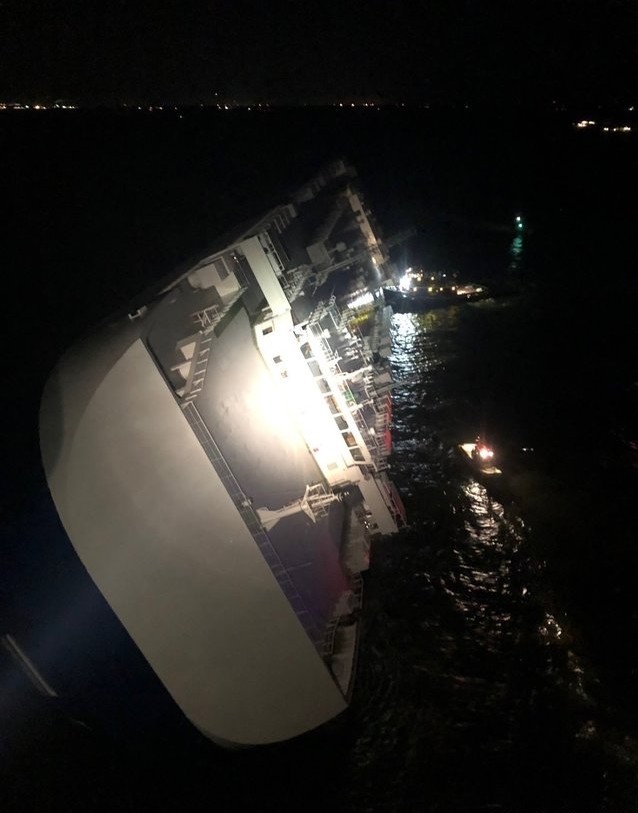 ▲ 8일 미국 남동부 해상에서 현대 글로비스 소속 대형 자동차 운반선 '골든레이'호가 전도된 모습. [미 해안경비대 트위터 캡처]