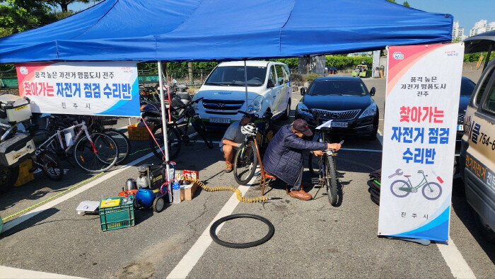 | ▲ 찾아가는 자전거 점검 수리반 운영 모습 [진주시 제공] |
