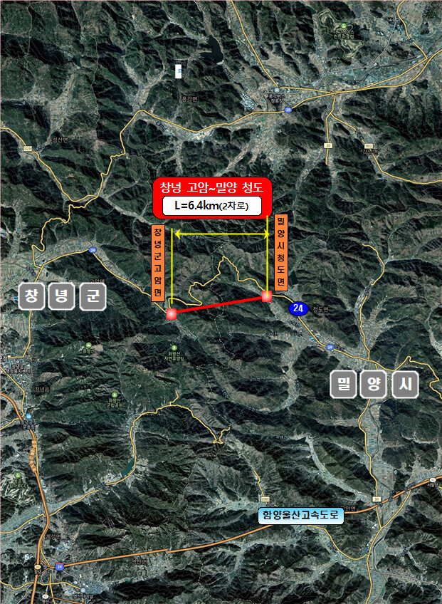 국도 24호선 밀양 청도~창녕 고암(6.4㎞, 1146억 원) 2차로 개량 사업의 경우 제5차 국도·국지도 건설계획에 반영돼 시행 중인 밀양 무안~부북간 도로와 연계해 사업효과 증대가 기대된다. 이곳은 도로의 굴곡과 종단경사가 심해, 차량사고 위험이 높은 지역이다.