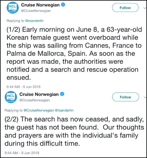 크루즈 선박의 선사인 '노르웨이지언 크루즈 라인' 측은 9일 트위터를 통해 "8일 이른 아침 배가 칸에서 마요르카로 향하던 중 한 성인 여성이 배에서 바깥으로 떨어졌다"며 "신고가 접수되자마자 관리자들에게 전달됐고 즉각 수색 및 구조 작업이 진행됐다"고 밝혔다.