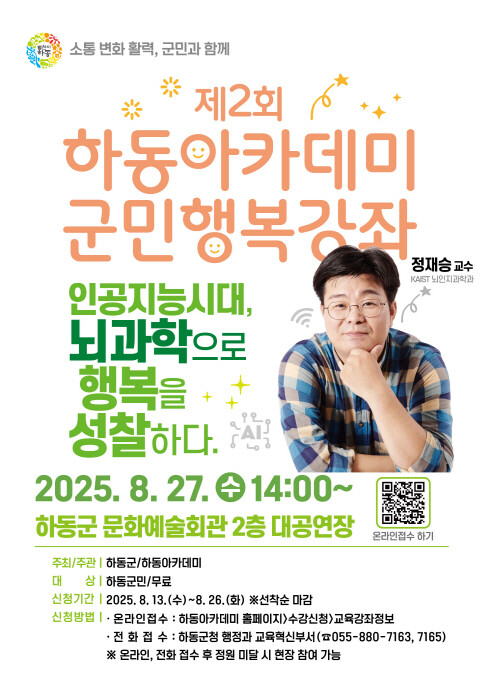 강좌의 참가비는 무료다. 희망자는 26일까지 하동아카데미 홈페이지나 전화로 사전 신청을 하면 된다. 잔여 좌석이 있을 시 현장에서 참석할 수 있다.