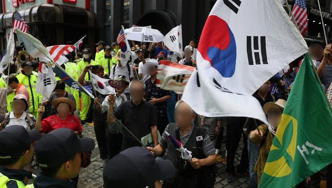 보수단체들은 "김경수를 구속하라"며 고성을 지르면서 준비해온 태극기와 성조기를 들고 흔들었다.