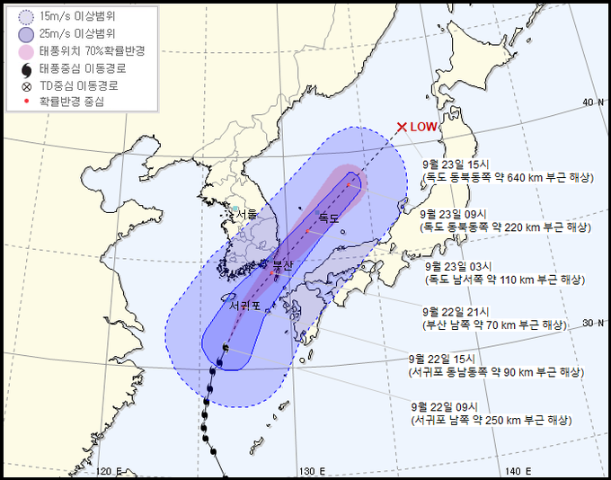 타파는 이날 오후 9시께 부산 남쪽 약 70㎞, 23일 오전 3시께 독도 남서쪽 약 110㎞ 부근을 지나 동해로 빠져나갈 것으로 보인다.