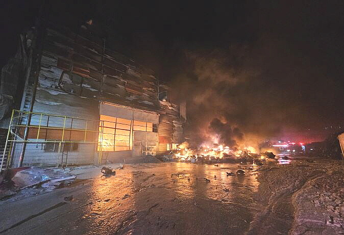| ▲ 10일 밤, 김해시 한림면 명동리 자원순환시설에서 발생한 화재 모습 [경남소방본부 제공] |
