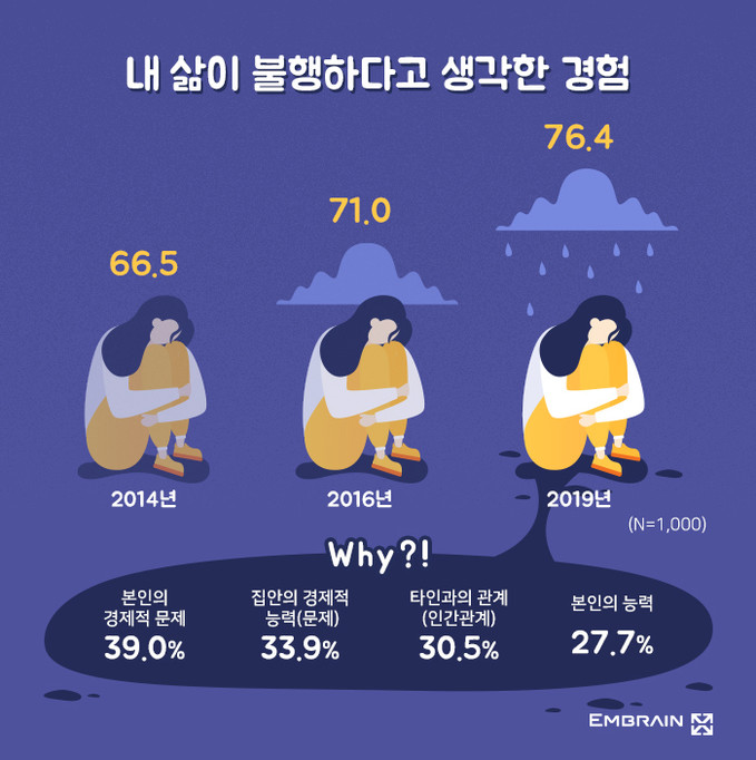 전국 만 19세~59세 성인남녀 1000명을 대상으로 진행된 이번 조사에서 전체 응답자의 76.4%는 자신의 삶이 불행하다고 생각한 적이 있다고 답했다. 이는 2014년 같은 기관 조사 결과(66.5%)보다 9.9%P 증가한 수치다.