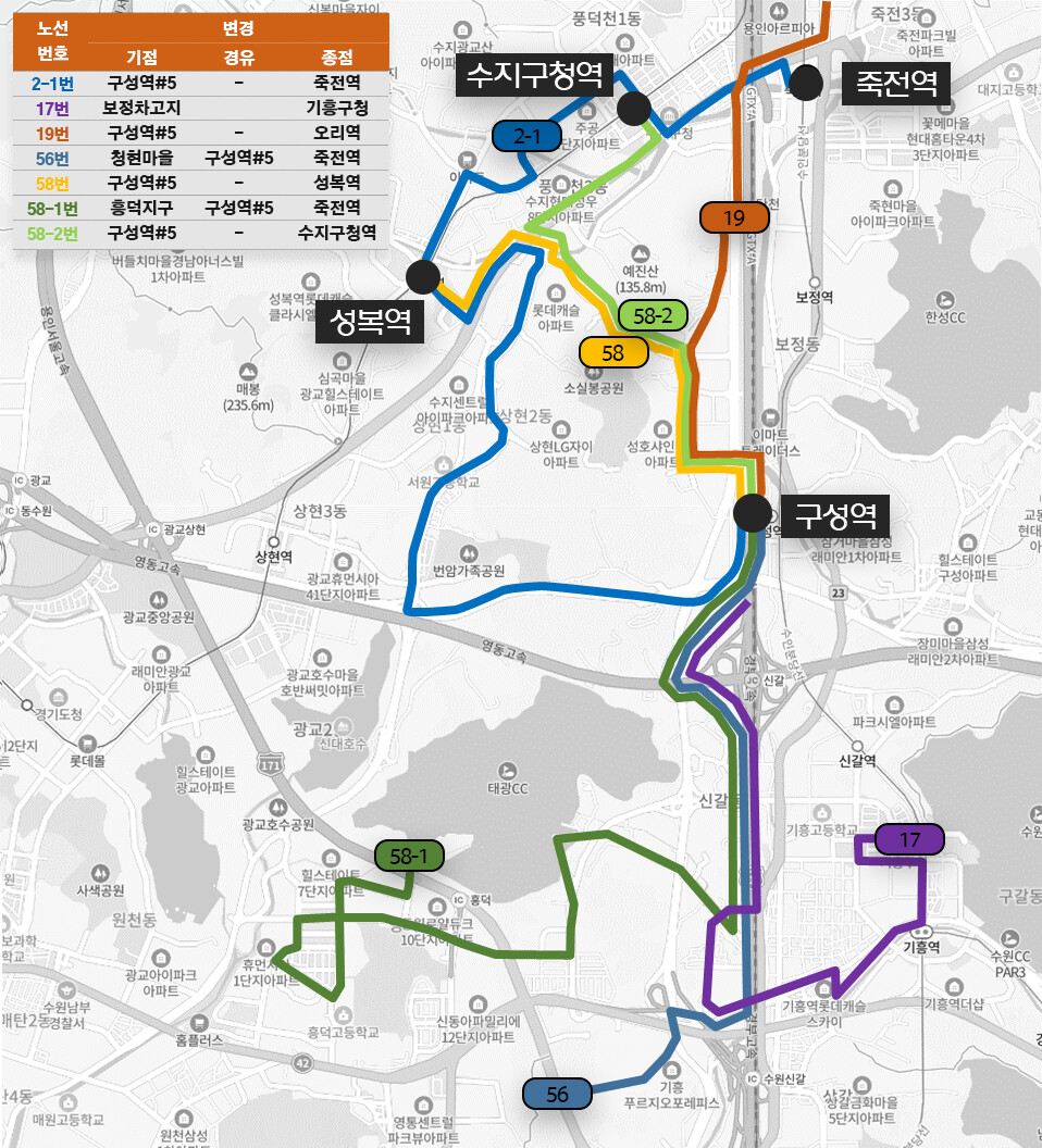 수지구 상현동·성복동·풍덕천동 등 일부 지역에서도 △2-1번(구성역~죽전역) △58번(구성역~성복역) △58-2번(구성역~수지구청역) 노선을 통해 구성역 이용이 가능해진다.