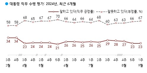 엠브레인퍼블릭 등 4개사가 전날 공개한 전국지표조사(NBS)에선 윤 대통령 부정 평가가 66%였다. 직전 조사(8월 4주차) 대비 3%p 상승했다. 66%는 지난 4월 총선 패배 후 최고치다.