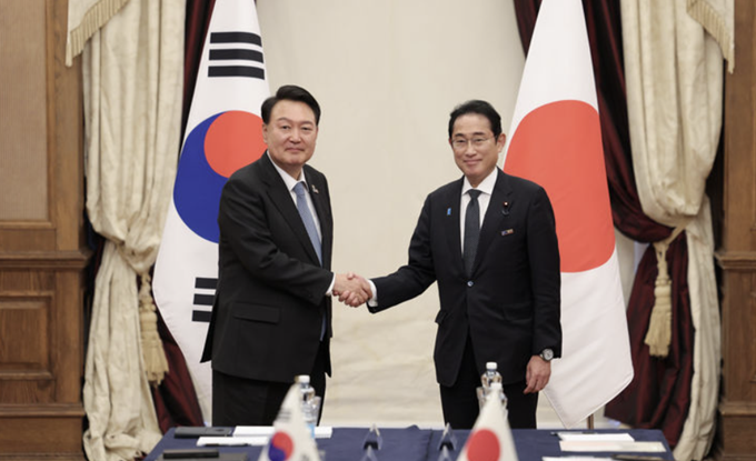 | ▲윤석열 대통령이 지난 7월 12일 리투아니아 빌뉴스 한 호텔에서 열린 한일 정상회담에 앞서 기시다 후미오 일본 총리와 악수하고 있다. [뉴시스] |