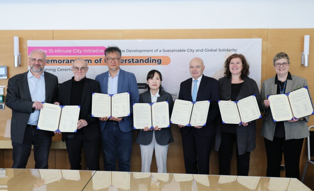 | ▲ 부산시와 파리 소르본대학 산하 연구소 관계자들이 '15분도시 업무협약'을 체결한 뒤 기념촬영을 하고 있다. [부산시 제공] |