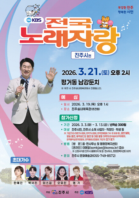 경남 진주시가 다음 달 21일 오후 2시, 평거동 남강둔치에서 'KBS 전국노래자랑 진주시 편'이 개최된다고 26일 밝혔다.