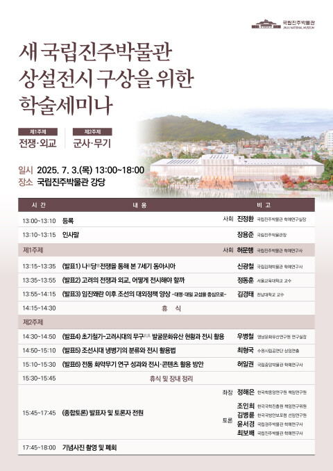 이번 세미나는 우리나라의 주요 전쟁·외교·무기 발달사 등을 종합적으로 살펴볼 수 있는 주제 발표와 종합 토론 순으로 진행된다. 아울러 국립진주박물관의 특성화 콘텐츠 '임진왜란'에 대한 적정성 및 확장 가능성도 검토할 예정이다.