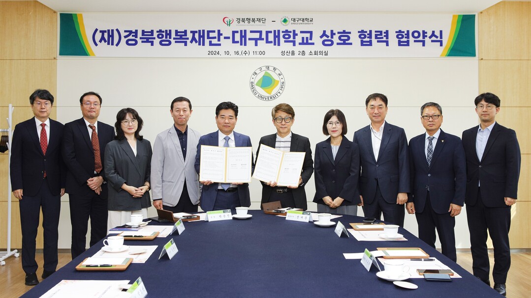 ▲대구대와 경북행복재단 관계자들이 협력 협약식을 갖고 기념촬영을 하고 있다.[대구대 제공]