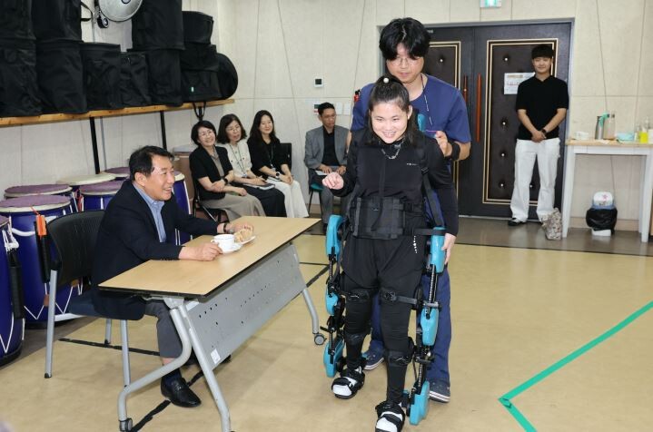 경남 양산시는 지난 7일 장애인복지관에서 보행장애아동을 위한 '웨어러블 돌봄로봇'을 첫 시연 행사를 가졌다.