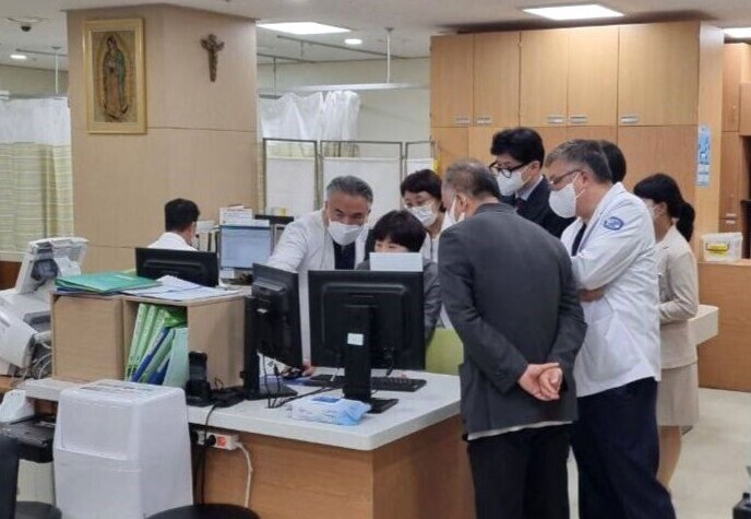 ▲ 국민의힘 한동훈 대표(오른쪽 세번째)가 지난 2일 서울 영등포구 가톨릭대 여의도성모병원 응급실을 찾아 현장을 점검하고 있다. [국민의힘 제공]