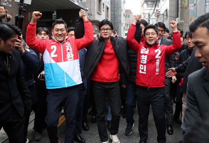 | ▲ 국민의힘 한동훈 비대위원장(가운데)이 지난 20일 서울 광진구 화양동에서 단수공천을 받은 김병민 광진 갑 후보, 오신환 광진을 후보와 함께 손을 맞잡고 걸어가고 있다. [뉴시스] |