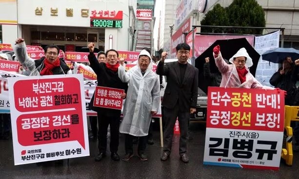 여당이 상대적으로 조용하더라도 공천 잡음이 없는 건 아니다. 컷오프된 이수원 전 국회의장 비서실장(부산진구갑) 등 예비후보 6명은 서울 여의도 중앙당사 앞에서 기자회견을 갖고 "꼼수 공천을 철회하라"고 요구했다. 이들은 "비대위가 평가 결과를 전면 재검토해야 한다"고 주장했다.