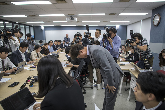 ▲ 30일 오전 서울 중구에 위치한 참좋은여행사에서 이상무 전무이사가 사고 관련 브리핑을 하며 고개를 숙이고 있다. [정병혁 기자]