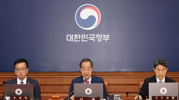 | ▲ 한덕수 국무총리(가운데)가 21일 서울 종로구 정부서울청사에서 주재한 국무회의에서 '채상병 특검법' 거부권 행사 요청과 관련한 발언을 하고 있다. [뉴시스] |