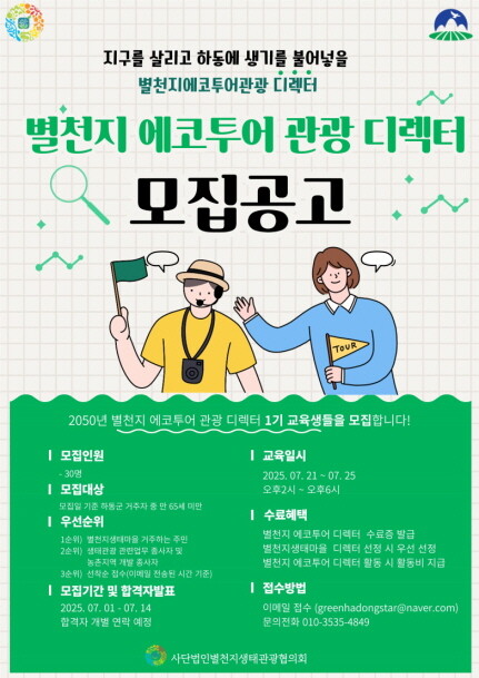 사단법인 별천지생태관광협의회(대표 정봉선)는 '별천지 에코투어 관광디렉터 양성과정'(21~25일) 개설에 앞서, 14일까지 교육생을 모집한다고 밝혔다.