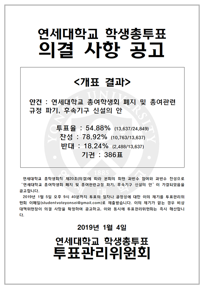 이번 학생총투표는 연세대 전체 회원 2만4849명 중 2535명의 요구로 본회 회원 10분의 1 이상의 요구가 있어 연세대 총학생회칙 제19조 1항에 따라 실시됐다.