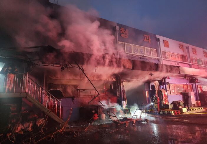 ▲ 1일 밤 화재가 발생한 부산 엄궁동 청과물직판장 화재 현장 모습 [부산소방재난본부 제공]