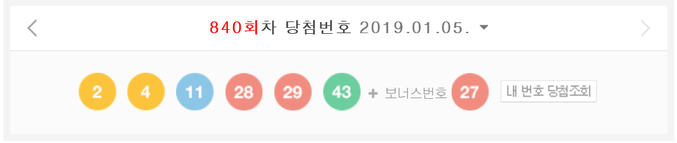 동행복권은 이날 제840회 로또6/45의 1등 당첨 번호가 2, 4, 11, 28, 29, 43으로 추첨 됐다고 밝혔다. 2등 보너스 번호는 27이다.