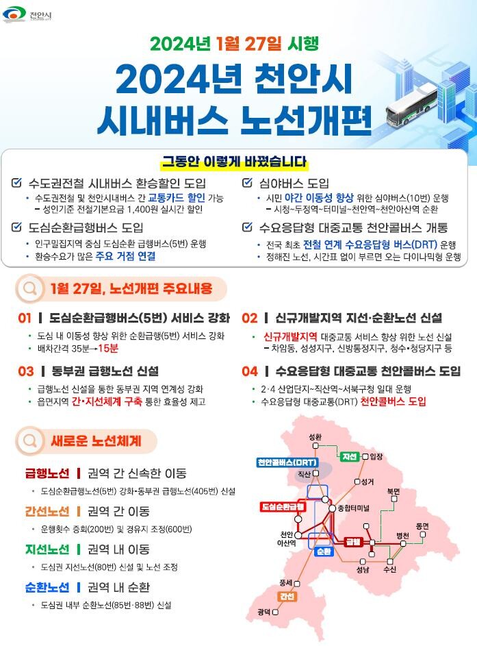 3년 여간에 걸친 스마트 교통혁신 사업의 마무리 단계인 시내버스 노선 전면 개편을 오는 27일 시행한다. 노선개편은 신규개발지역 지선·순환노선 신설, 도심순환급행버스 서비스 강화, 동부권 급행노선 신설, 수요응답형 대중교통 천안콜버스 확대운영 등을 골자로 한다.