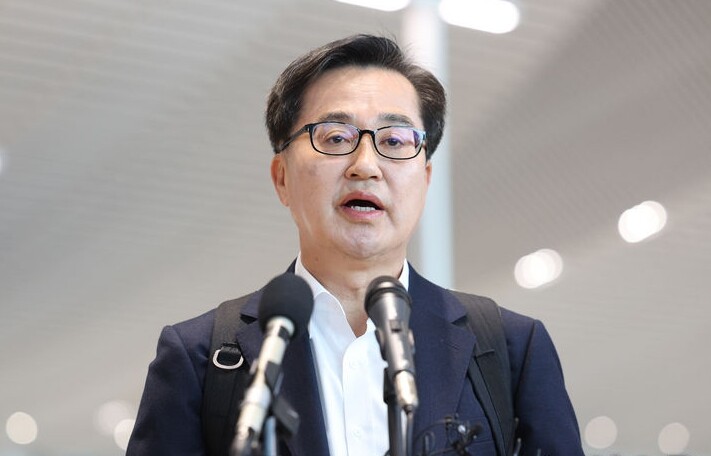 | ▲ 김동연 경기지사가 9일 인천국제공항 제2터미널에서 자동차 부품 관세 대응을 위한 미국 출장에 앞서 대선 출마 선언을 하고 있다. [뉴시스] |