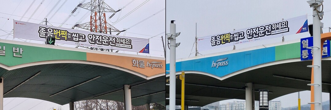 ▲한국도로공사 군자영업소(왼쪽)와 동수원영업소(오른쪽)에 졸음운전 예방 현수막이 설치된 모습.[롯데웰푸드 제공]