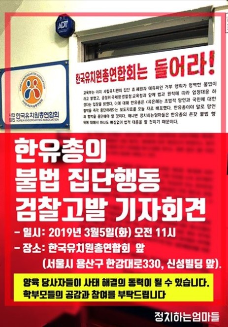 학부모단체 '정치하는 엄마들'은 5일 오전 11시 서울 용산구 한유총 앞에서 기자회견을 열어 한유총의 개학 연기를 규탄하고, 유아교육법 등 위반 혐의로 검찰에 고발하기로 한다고 밝혔다.