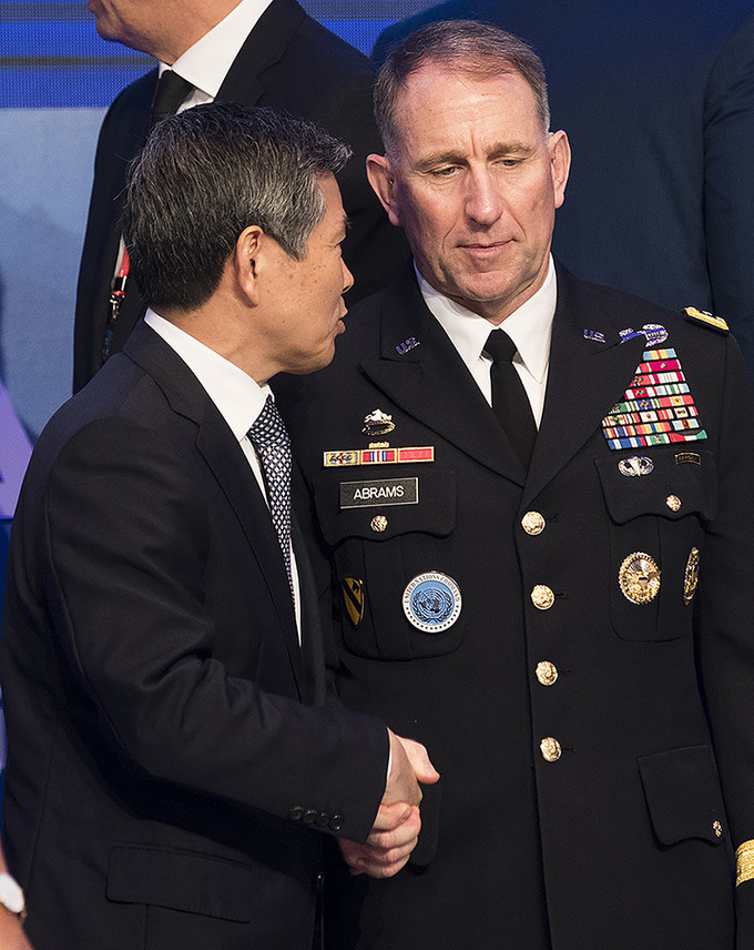 ▲ 정경두 국방장관과 로버트 에이브럼스 한미연합사령관이 지난달 5일 오전 서울 중구 롯데호텔에서 열린 2019 서울안보대화(Seoul Defense Dialogue 2019) 개회식에서 악수를 하고 있다.[정병혁 기자]