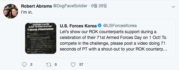 에이브럼스 사령관은 지난 26일 자신의 트위터에 "'국군장병 응원 71초 챌린지'에 참여해 국군의날을 응원하자"는 내용의 주한미군 트윗을 올려놓고 '나도 함께하겠다'(I'm in)는 글을 남긴 바 있다.
