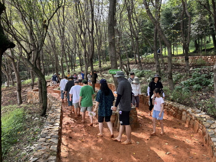 '맨발로숲 산림치유 프로그램' 참가자는 왕복 약 1.2㎞ 황톳길에서 산림치유지도사의 전문적인 안내를 받으며 90분 동안 산림치유를 체험할 수 있다. 산림치유와 어싱(earthing) 효과를 두루 누릴 수 있는 프로그램이다.