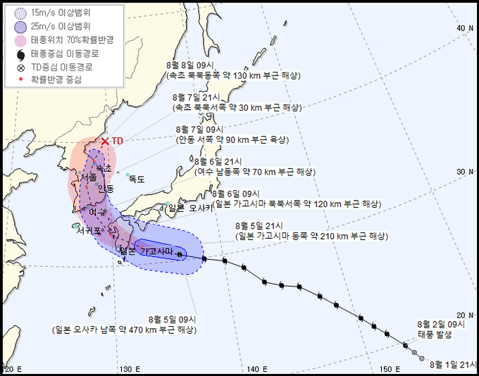 아울러 프란시스코는 7일 새벽 3시께 통영 북서쪽 부근 육상을 통과해 같은 날 오후 충북 충주와 강원 속초를 지나 동해상으로 빠져나갈 전망이다.