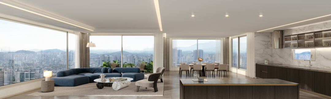 세대구성을 보면 전용 59㎡를 초과하는 평형을 932세대로 설계하여 조합원들의 수요를 완벽히 맞췄다. 특히, 전체 세대의 절반이 넘는 622세대에는 3면이 개방된 설계를 적용해 개포우성7차만이 갖고 있는 입지적 특장점인 대모산, 양재천, 탄천, 도심 등 모든 다양한 종류의 조망을 서라운드로 누릴 수 있도록 계획했다. 여기에 3면의 거대한 조망형 창호를 통해 완벽한 개방감을 누릴 수 있도록 했다.