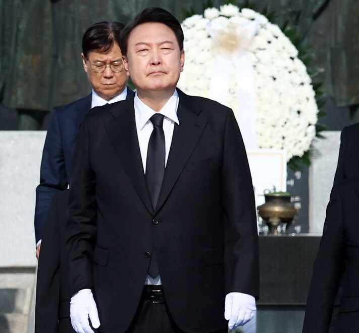 | ▲ 윤석열 대통령이 19일 서울 강북구 국립4·19민주묘지를 찾아 4월학생혁명기념탑에서 참배한 뒤 이동하고 있다. [뉴시스] |