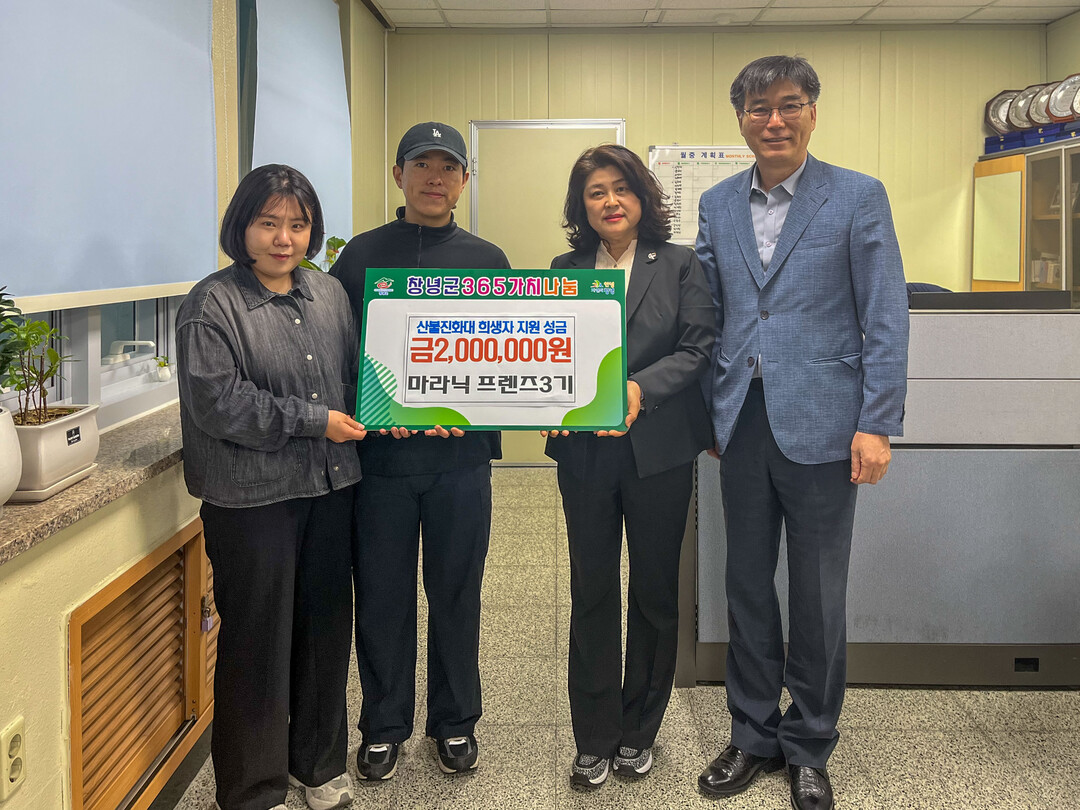 창녕군은 지난 4월 30일 러닝 동호회 '마라닉 프렌즈' 3기에서 창녕군 산불진화대 피해자를 위한 성금 200만 원을 기탁했다고 2일 밝혔다.